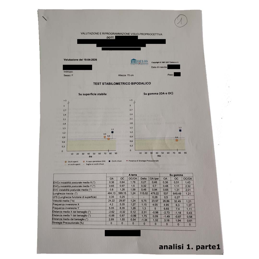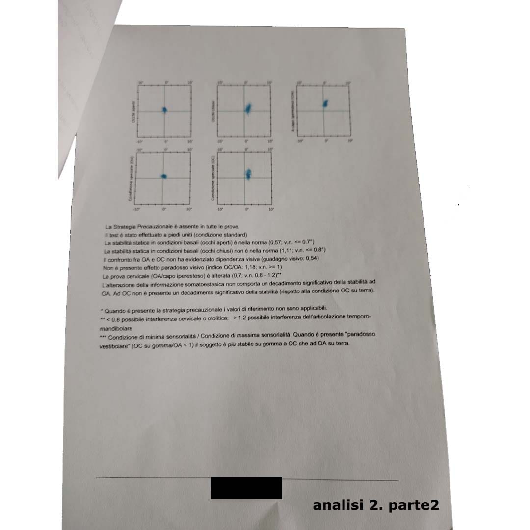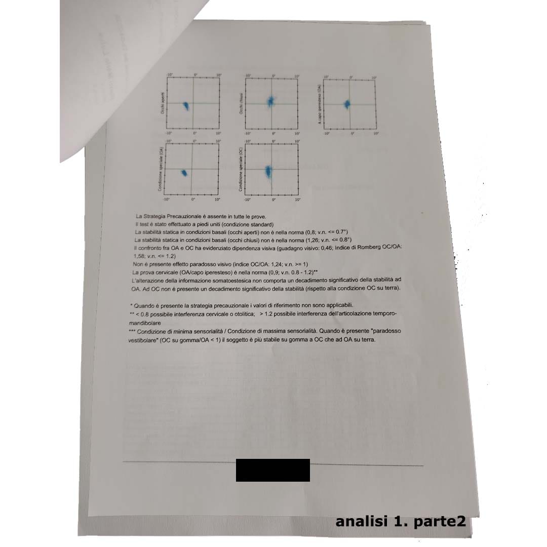I pazienti sono stati sottoposti, prima di tutto, a un esame stabilometrico, ovvero un test che serve a valutare il grado di propriocezione e il controllo dell’equilibrio. In parole semplici, permette di rivelare le alterazioni inconsapevoli e non controllabili che coinvolgono il sistema nervoso, gli occhi, la mascella e tutto l’asse della colonna vertebrale. Queste alterazioni possono essere segno, ad esempio, di possibili patologie neuropatiche, così come di alterazioni del bacino, della vista ecc..